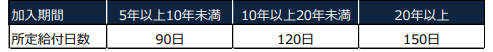 ・給付日数は、雇用保険に加入していた期間(上記(1)②の期間)に応じて異なり、下記の表の通りとなります。